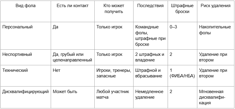 Несмотря на общую систему, каждый вид фола влияет на игру по-разному. Персональный фол — рабочий элемент, неспортивный — угроза быстрых очков сопернику, технический — прямой удар по дисциплине команды, а дисквалифицирующий — потеря человека, которая меняет весь рисунок встречи.