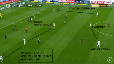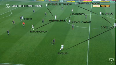Российско-бразильский вратарь «Локомотива» Гилерме играет важную роль для чистого выхода «Локомотива» из обороны в атаку. Для получения мяча от голкипера назад отходит Баринов, центральные защитники открываются ближе к флангам, а латерали поднимаются к 30-35 метрам от ворот. При такой расстановке Крыховяк может действовать выше, ожидая передачи и думая о начале комбинации с Миранчуками.