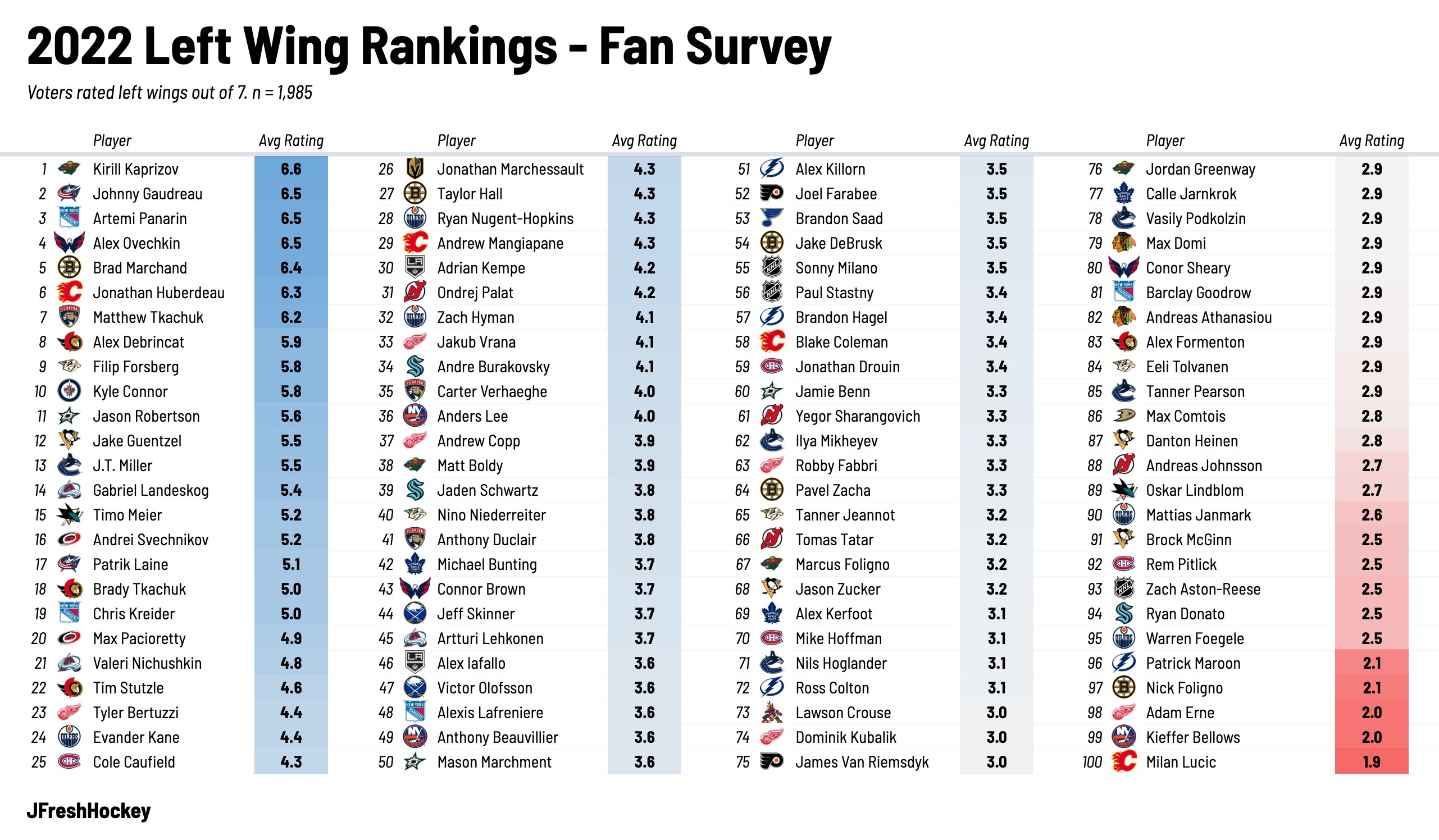 Читатели аналитического сайта EP Rinkside составили рейтинг топ-100 лучших левых вингеров, выступающих в Национальной хоккейной лиге на данный момент. Список был создан посредством открытого голосования североамериканских болельщиков.