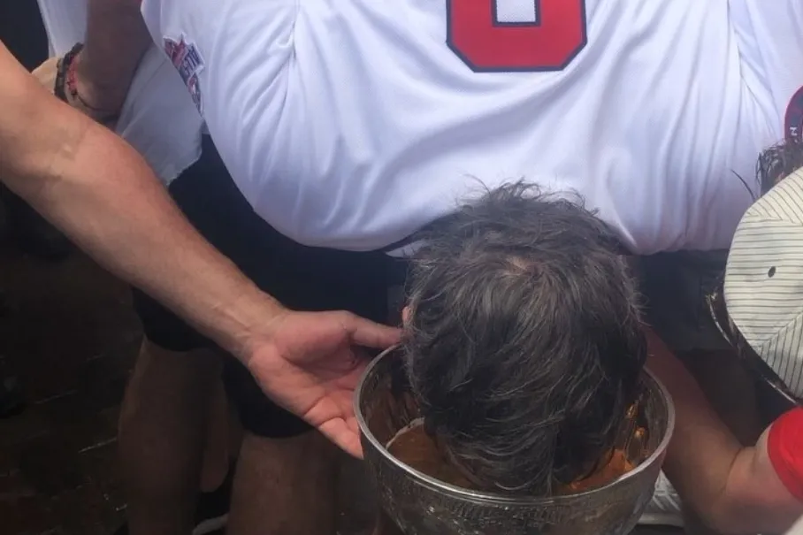 «Я скажу, как придумал идею с распитием из Кубка», — вспоминает Оши. «Было очень жарко, пива почти не было, вокруг нас толпились фанаты, и я подумал: «Надо что-то придумать, чтобы оживить обстановку». Я сказал Тому Уилсону — мы с ним немного партнёры по безумию: «Давай будем пить из Кубка вниз головой». Он такой: «Серьёзно?» А я: «Да, давай». Том говорит: «Ладно, пошли». А я добавил: «Погоди, первым должен быть Ови».