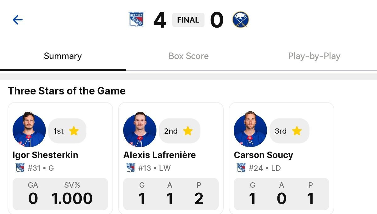 Национальная хоккейная лига назвала Игоря 1-й звездой игры, по итогам которой ньюйоркцы разгромили «Баффало» со счетом 4:0.