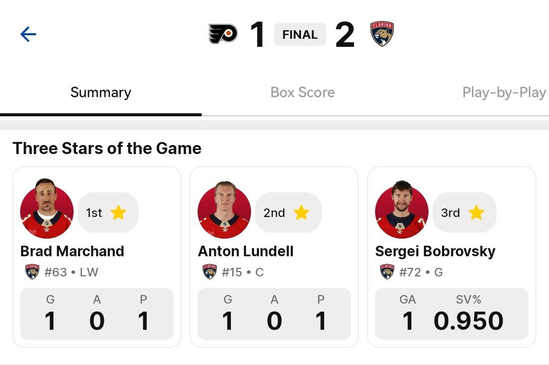 В матче с «Филадельфией» Бобровский отразил 19 бросков из 20 – «Флорида» снова одержала победу с разницей в одну шайбу (2:1).