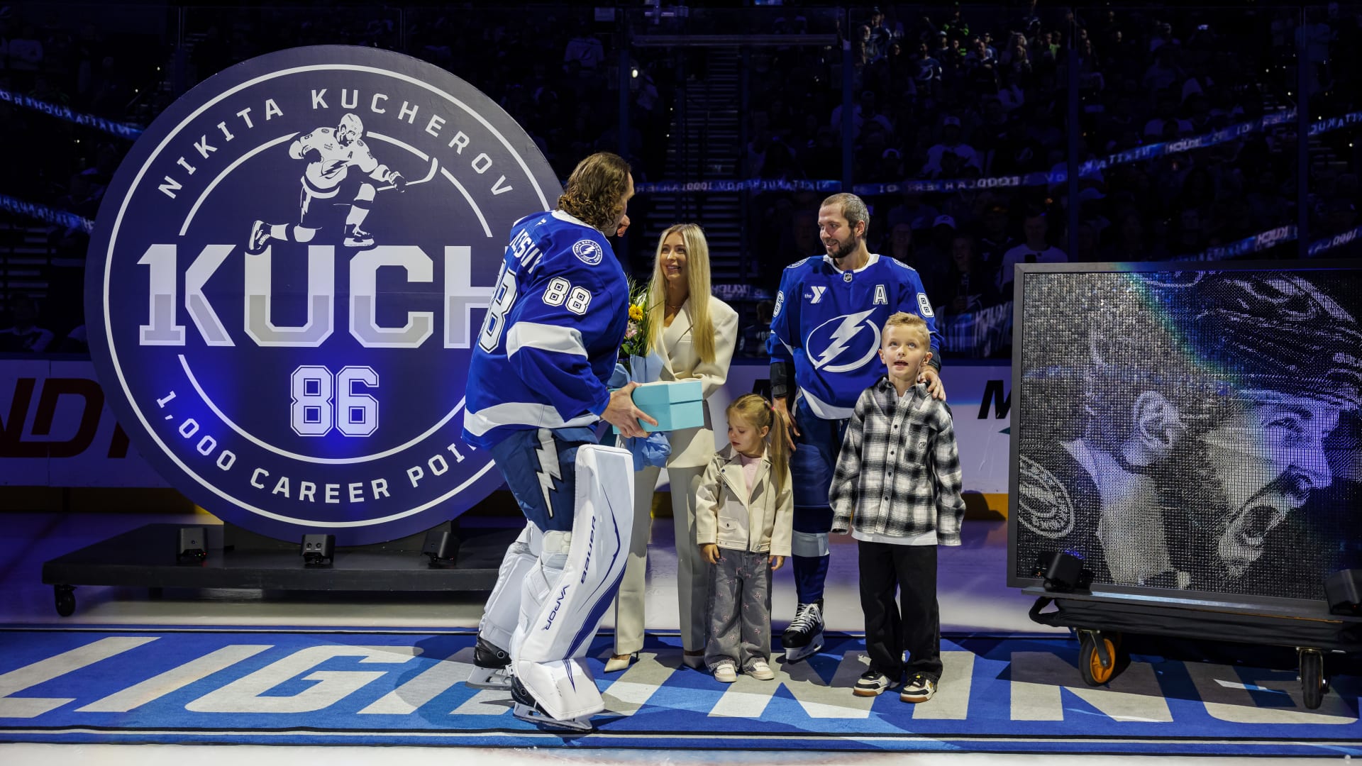 После этого Кучеров получил памятный подарок из хрусталя от своего друга и голкипера «Лайтнинг» Андрея Василевского, часы с индивидуальной гравировкой – от капитана «молний» Виктора Хедмана, а также позолоченную клюшку – от совладельца клуба Дуга Островера.