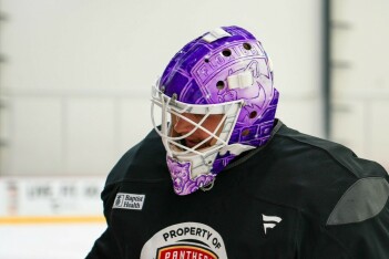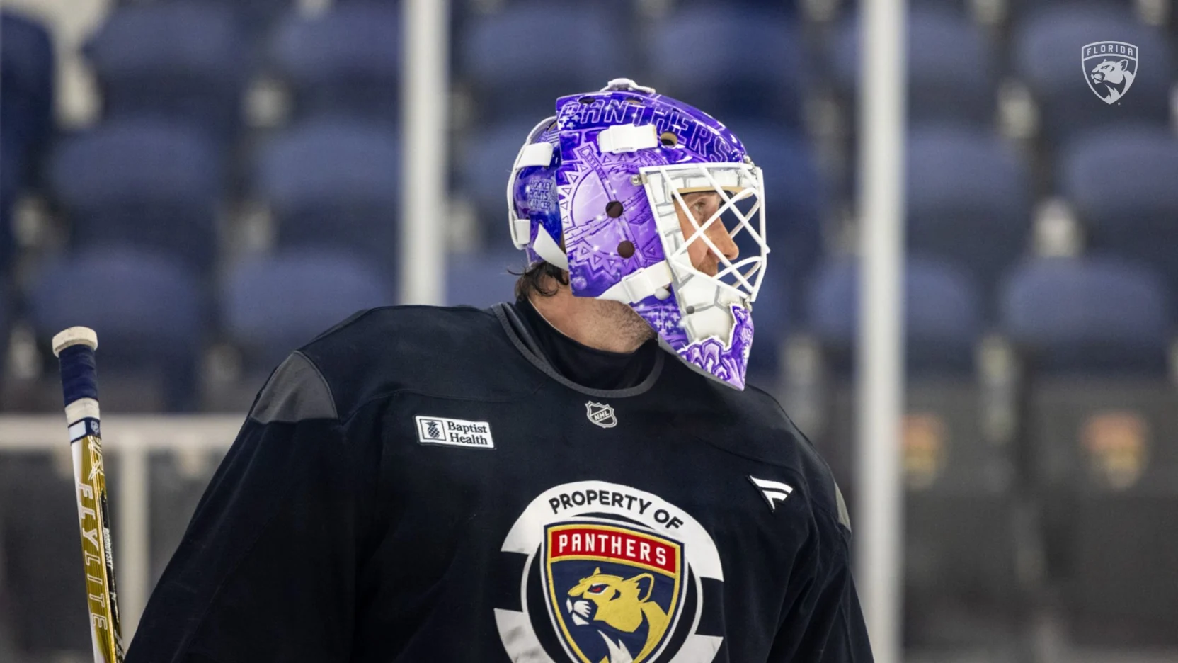 Вратарь «Флориды» во время утренней раскатки в понедельник представил свой вратарский шлем в поддержку ежегодной инициативы Hockey Fights Cancer, демонстрируя участие в борьбе с раком.