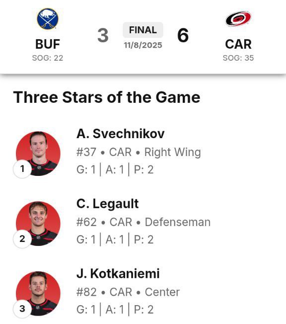 Так, в эту субботу Свечников отметился двумя яркими результативными действиями, став главным героем встречи с «Баффало», по итогам которой «Каролина» уверенно победила 6:3.