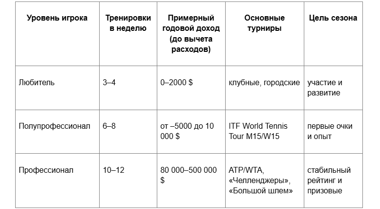 Средний теннисист ATP или WTA тренируется по шесть часов в день. Любители занимаются два-три раза в неделю, а полупрофессионалы — около пяти-шести. Именно интенсивность и режим отличают любителя от профессионала.