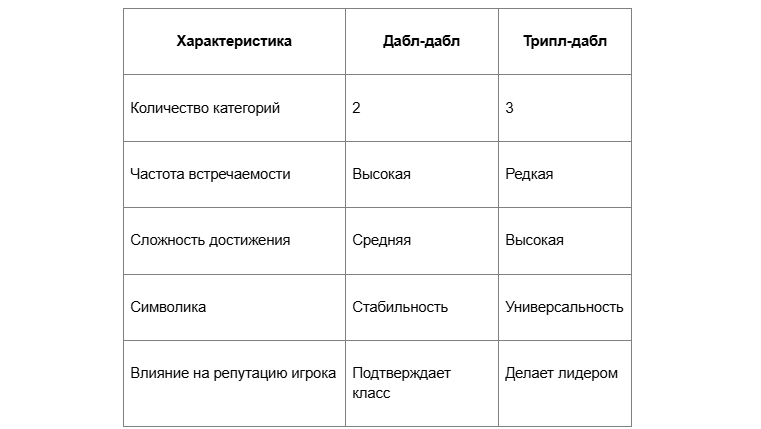 Разница между двумя показателями принципиальна. Дабл-дабл фиксирует надёжность игрока, его способность стабильно выполнять свою работу. Тройной дубль, напротив, говорит о выходе за рамки одной позиции. Это уже показатель того, что спортсмен способен влиять на игру комплексно — и в атаке, и в защите, и в организации.