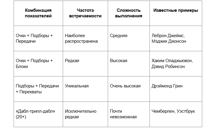Двойной дубль фиксируется при двузначных цифрах в двух категориях. Тройной — уже в трёх. Второй вариант встречается реже и считается более престижным. - Кто сделал больше всего трипл-даблов в истории НБА?