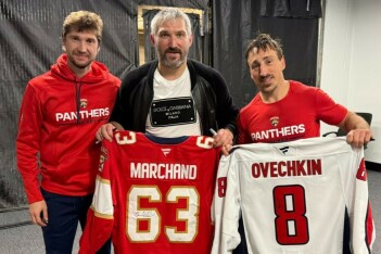 За пределами раздевалки Овечкин и Маршанд обменялись подписанными джерси и сделали совместное фото. Справа от Ови позировал российский голкипер Сергей Бобровский, которого в минувшей встрече подменял Даниил Тарасов.