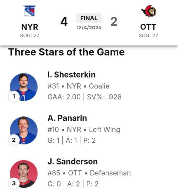 НХЛ включила Шестеркина и Панарина в число 3 звезд матча, по итогам которого «Рейнджерс» взяли верх над «Оттавой» со счетом 4:2.