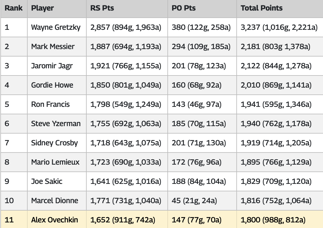 Чтобы добраться до планки в 1800 результативных действий, Овечкин суммарно в регулярках и плей-офф оформил 988 голов и 812 передач. 988 — второй результат в истории после Уэйна Гретцки (1016). Алексу требуется ещё 39 шайб, чтобы обойти канадца.