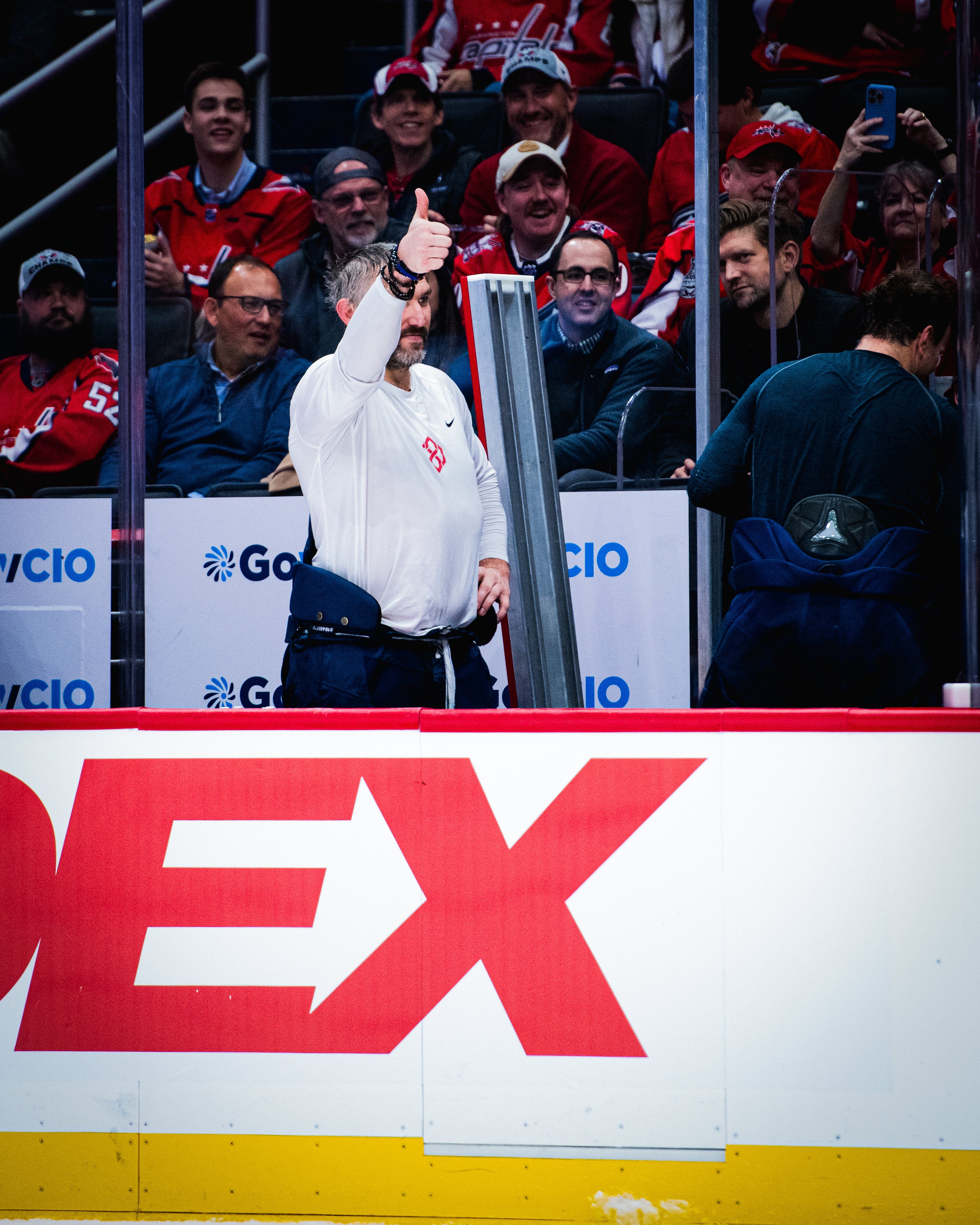 Алекс показал сыну поднятый большой палец, наблюдая за происходящим со скамейки запасных «Кэпиталз» вместе с партнёром по команде Джоном Карлсоном.