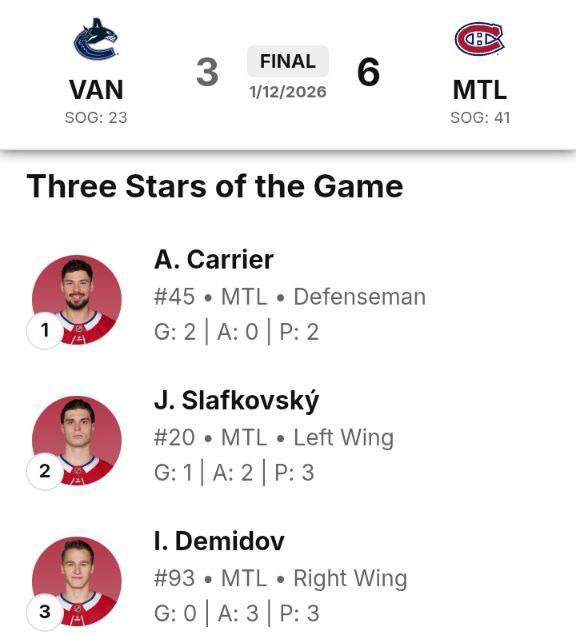 Ассистентский хет-трик Демидова привел его к званию третьей звезды матча с «Ванкувером», по итогам которого «Канадиенс» уверенно выиграли 6:3.
