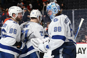 У Василевского остаются 19 побед в нынешней кампании – российский вратарь «Тампы» отражает 91,5% бросков, пропуская в среднем за игру 2,26 гола.