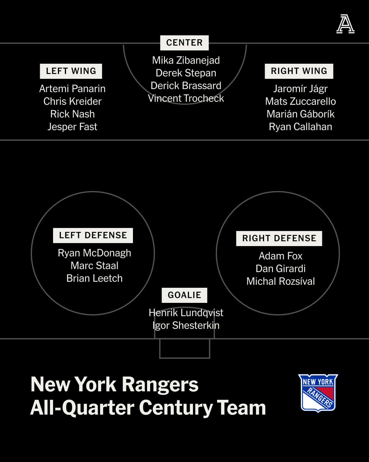 Критерии отбора основывались на попытке соблюсти баланс между влиянием на игру и продолжительностью выступлений за клуб. В команду попали несколько хоккеистов, которые провели в Нью-Йорке относительно недолгое время, но играли ключевую роль, тогда как другие были отмечены за стабильность на протяжении более длительного периода. Это привело к ряду интересных дискуссий, к которым мы ещё вернёмся ниже.