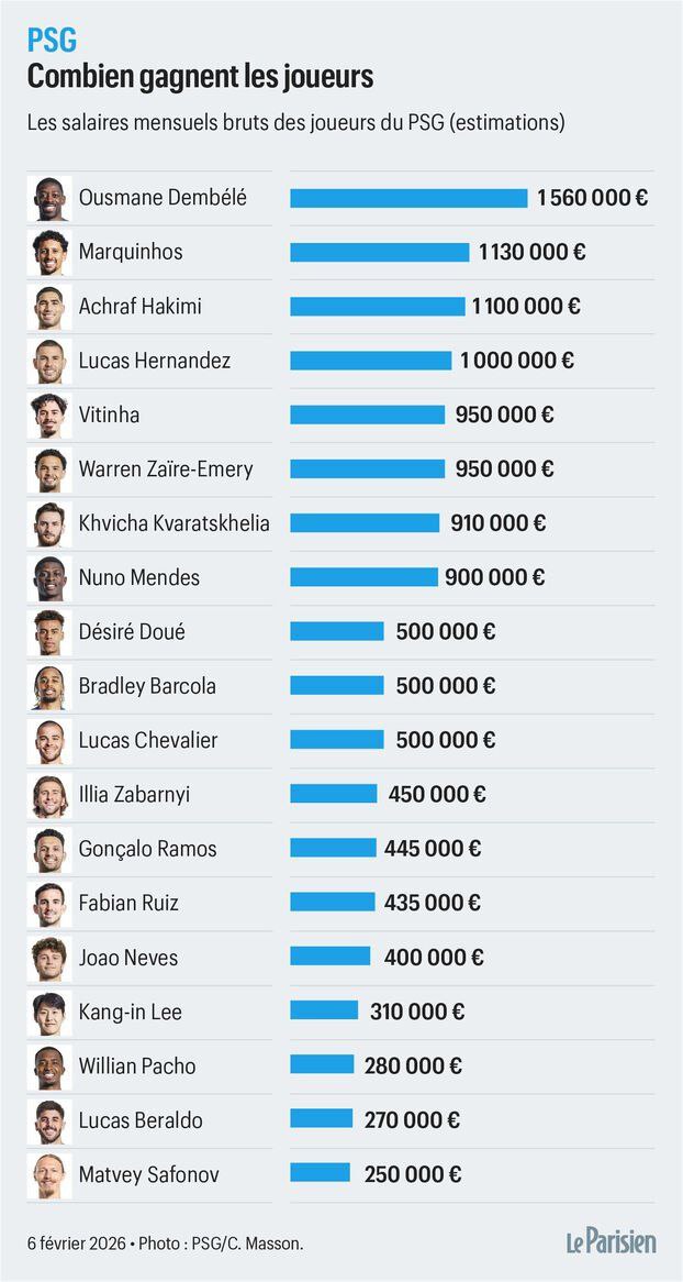Самым высокооплачиваемым футболистом парижан назван Усман Дембеле, месячное жалование которого составляет более 1,5 млн евро.