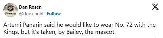 «Артемий Панарин сказал, что в «Кингз» хотел бы носить номер 72, но он уже занят - талисманом команды, Бейли».