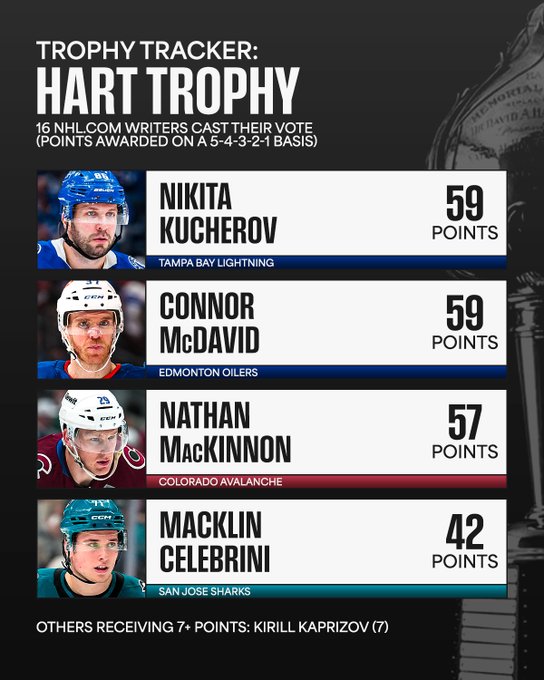 Прямо сейчас в гонке за «Харт Трофи» есть 3 явных претендента: наряду с Кучеровым большие шансы забрать награду также имеют Коннор Макдэвид и Нэтан Маккиннон. После того, как Никиту проигнорировали в двух последних сезонах, кажется, что сейчас настало его время снова стать MVP кампании.