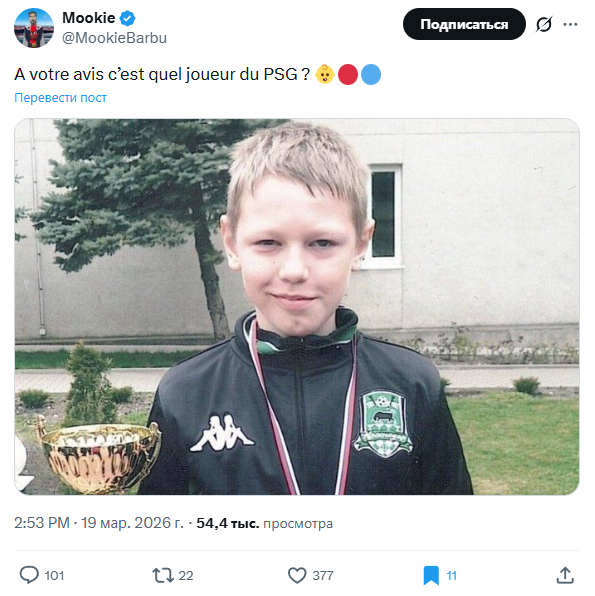 Аккаунт Mookie выложил снимок россиянина времён его выступлений за академию «Краснодара» без подписи и предложил угадать в ребенке нынешнего игрока «ПСЖ»: