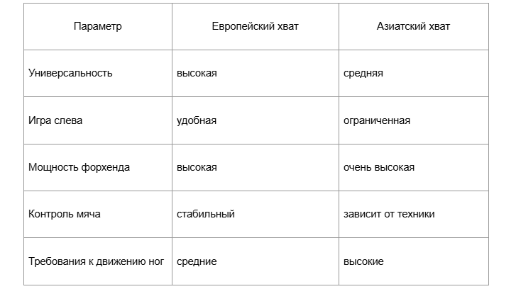 Каждый из них формирует свой игровой почерк. Например, европейская техника позволяет одинаково уверенно играть с обеих сторон. Азиатская же чаще делает акцент на мощной атаке справа.