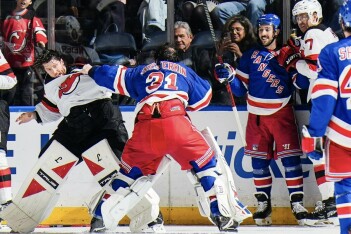 Голкипер «Нью-Йорк Рейнджерс» Игорь Шестёркин стал одной из главных фигур игрового дня в НХЛ — и вовсе не только из-за игры в воротах. В матче регулярного чемпионата против «Нью-Джерси Дэвилз» (4:1) российский вратарь подрался с голкипером соперника Якобом Маркстремом, а затем эффектно уложил его на лёд.